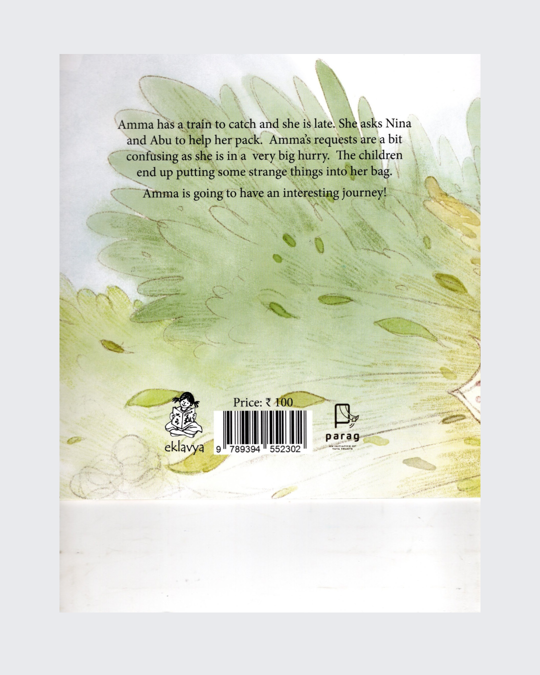 Amma has a train to catch and she is late. She ask Nina and Abu to Help her pack. Amma's requests are bit confusing as she is in a very big hurry. The children end up putting some strange things into her bag.