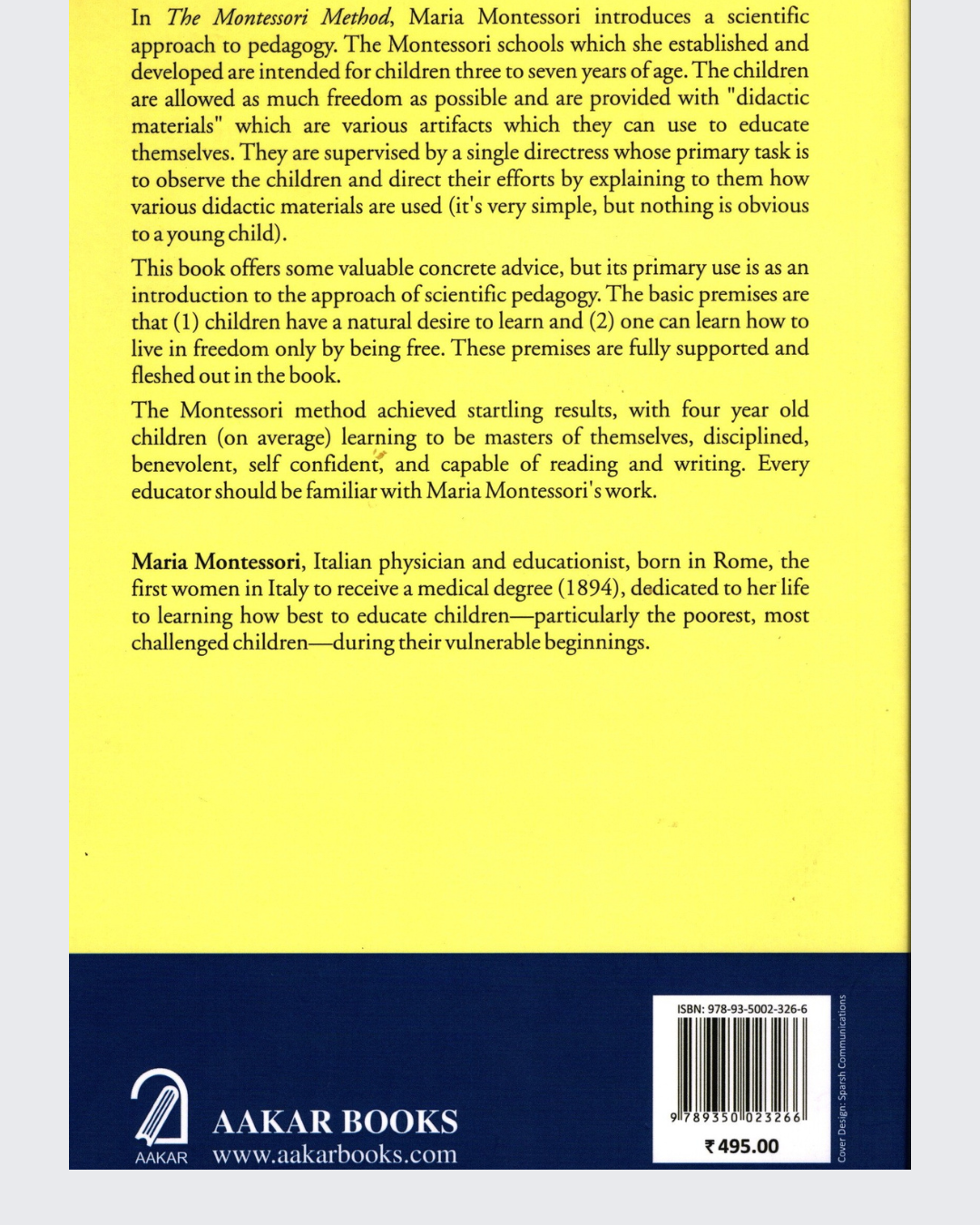 In The Montessori Method, Maria Montessori introduces a scientific approach to pedagogy. The Montessori schools which she established and developed are intended for children three to seven years of age. The children are allowed as much freedom as possible and are provided with "didactic materials" which are various artifacts which they can use to educate themselves. They are supervised by a single directress whose primary task is to observe the children and direct their efforts by explaining to them how various didactic materials are used (it's very simple, but nothing is obvious to a young child).